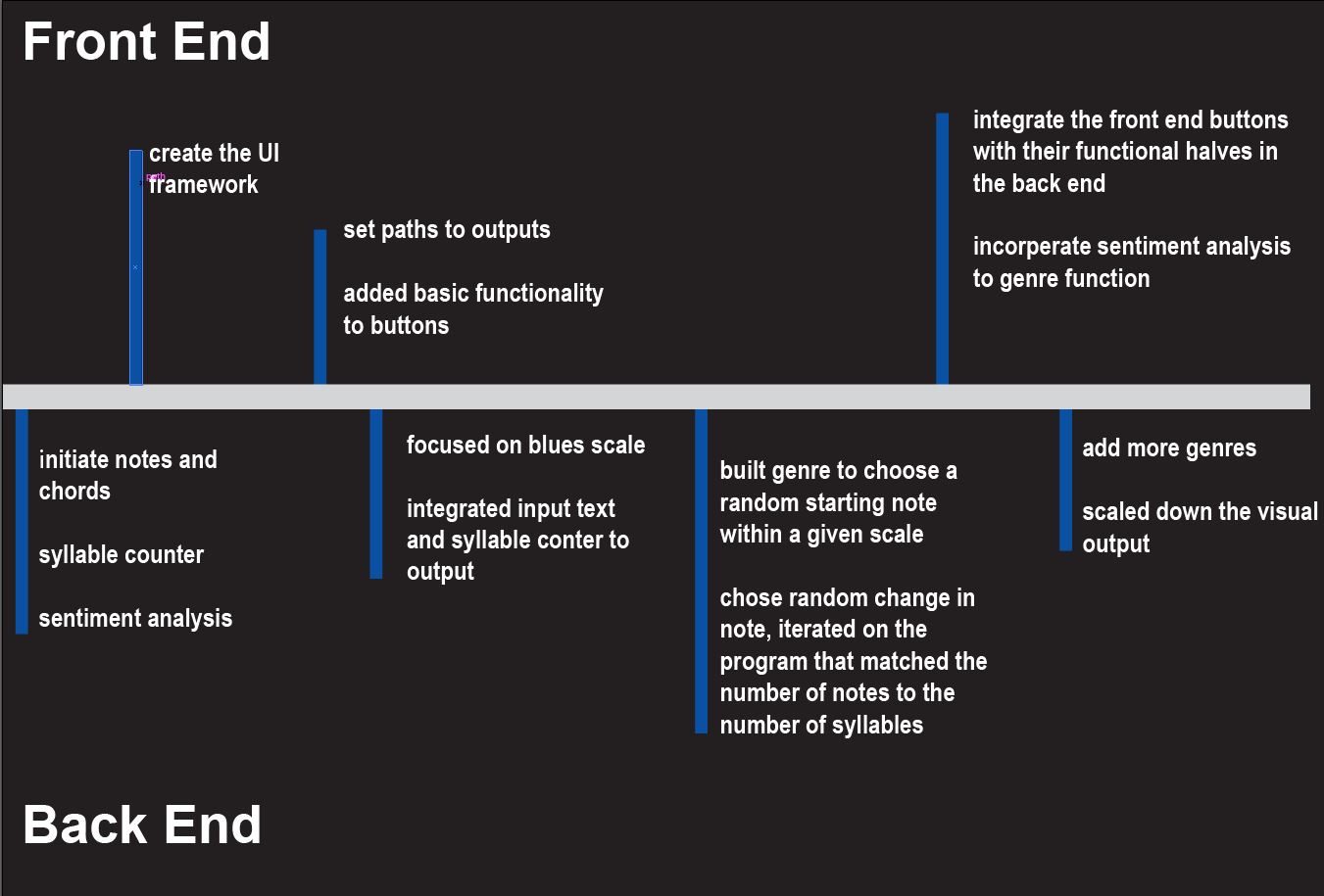 It all started with a whiteboard, post-its, and some sharpies. We started ideating what features we would want in a music generator, and ended up with the following concept:
